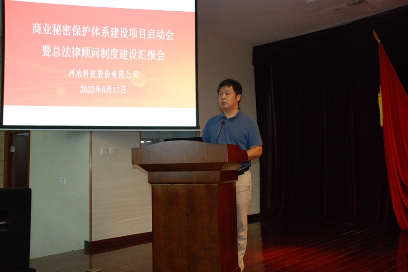 8月17日,河冶科技召開商業秘密保護體系建設項目啟動會暨總法律顧問制度建設匯報會在河冶多功能廳召開。安泰科技總法律顧問、商密總代表王勁東,河冶科技總經理米永旺,河冶高管團隊,安泰科技商密辦公室成員,河冶各部門商密代表及商密管理員參會。會議由河冶科技總法律顧問劉鵬杰主持。