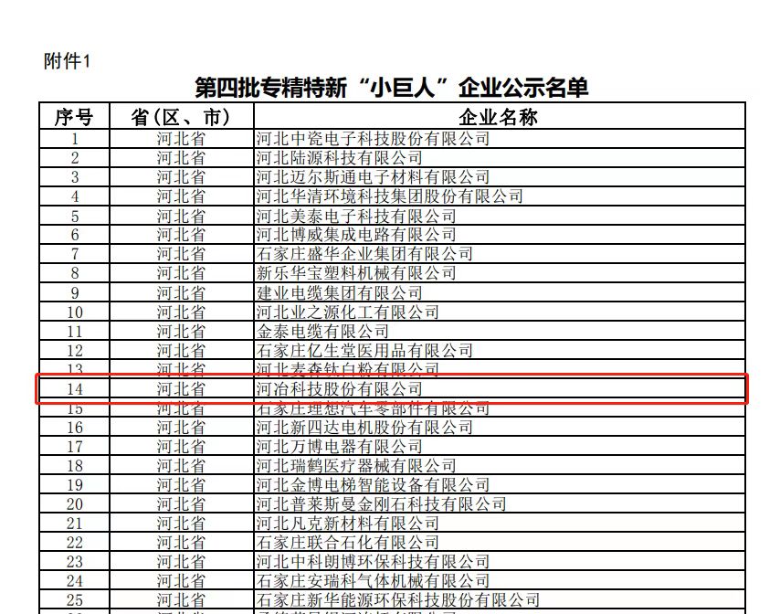2022年國家工信部第四批專精特新“小巨人”企業已完成公示,河冶科技股份有限公司通過嚴格的審核,獲得國家級專精特新“小巨人”認定。這是繼獲得河北省專精特新示范企業榮譽稱號后,首次獲得國家級“小巨人”的認定,體現了公司在專、精、特、新四個領域的長足發展。
